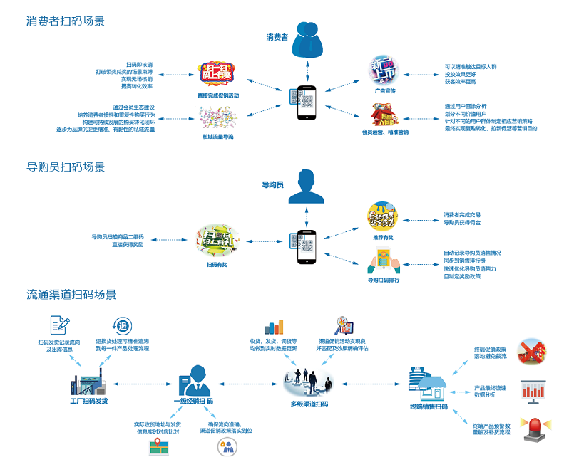 通過消費者通過掃碼,與品牌形成線上互動,實現(xiàn)防偽查詢、防竄預(yù)警、終端消費者營銷、導購員促銷、渠道動銷,同時收集消費者用戶數(shù)據(jù)和用戶畫像,最后通過數(shù)據(jù)分析,可以為不同產(chǎn)品,不同區(qū)域,不同時間段,不同用戶設(shè)置不同的精準營銷政策活動,如紅包,待解鎖紅包,積分,實物換購,優(yōu)惠券,第三方獎品等各類活動。 對于影響銷量的觸點人員,如消費者,促銷員,導購員,業(yè)務(wù)員等可設(shè)置不同獎勵,提升銷售積極性,提高產(chǎn)品銷量。