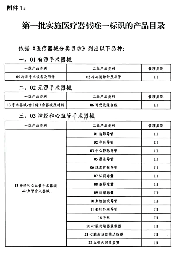 第一批實施醫(yī)療器械唯一標(biāo)識的產(chǎn)品目錄 UDI 69個品種表說明附件1
